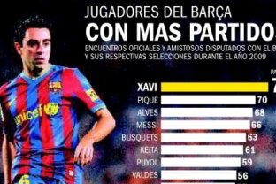 Mijlocaşul a fost implicat în majoritatea jocurilor Barcei, fiind un om de bază pentru toate succese obţinute de echipa lui Guardiola în 2009. Xavi a fost pe teren în nu mai puţin de 76 de meciuri în ultimele 12 luni, meciuri oficiale sau amicale desfăşurate în tricoul clubului, al naţionalei Spaniei sau ale Catalunyei.