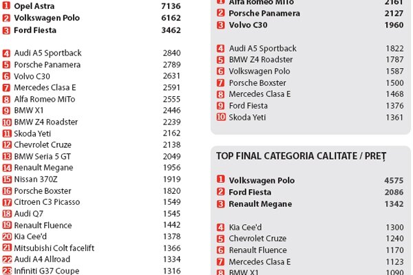 Opel Astra, marele câstigator al concursului Autovot 2010, a primit 7136 puncte prin adunarea rezultatelor la cele doua categorii. Deoarece Opel Astra a reusit sa isi adjudece prima pozitie la ambele categorii de votare, locurile întâi la fiecare dintre acestea au fost acordate, conform regulamentului, urmatoarelor doua modele clasate. Astfel, la categoria Best Buy (Raport Calitate/Pret), modelul Volkswagen Polo (4575 puncte ) a câstigat locul întâi, urmat de Ford Fiesta (locul al doilea – 2086 de puncte) si Renault Megane (locul al treilea – 1342 de puncte).