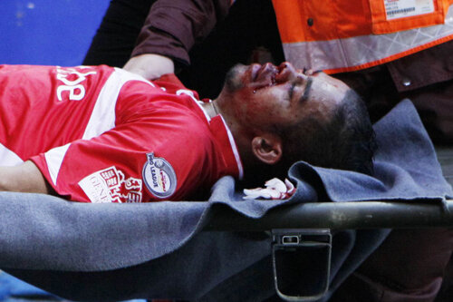 Moment de groază în "finala" campionatului belgian, Genk - Standard (1-1). Era minutul 28. Lansat de dreapta, mijlocaşul oaspeţilor, Mehdi Carcela, a preluat mingea cu capul. N-a putut face mai mult. Venit din spate, Chris Mavinga l-a lovit violent în figură, în tentativa de a degaja. Carcela a căzut moale la pămînt. Era inconştient, cu faţa plină de sînge. Avea convulsii. Medicii au sărit rapid să-l îngrijească, jucătorii au chemat panicaţi oamenii cu targa. A fost dus urgent la spital.
