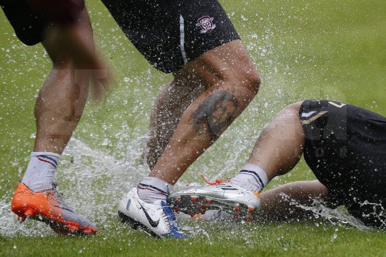 Chiar dacă şedinţa de pregătire nu a fost una de intensitate maximă, ploaia care a căzut aproape permanent parcă i-a îndemnat pe fotbalişti la tacklinguri, Ionuţ Dobroiu şi Daniel Pancu fiind printre cei care s-au resimţit. Pe primul l-a lovit Alexa, iar Pancu a primit o minge în cap şi a fost călcat de acelaşi jucător, Romeo Surdu.