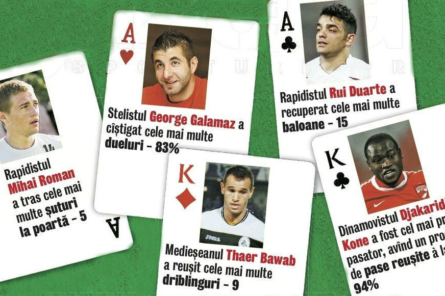 Evidenţiaţii serii au fost Galamaz, Kone, Bawab, Duarte şi Mihai Roman. Primul a cîştigat 83% din dueluri, iar dinamovistul a greşit doar 4 pase din 66. Iordanianul de la Gaz Metan a bifat 9 driblinguri, cu unul mai puţin decît toţi steliştii la un loc, Duarte a fost surprinzător cel mai bun recuperator, în timp ce Mihai Roman a tras cele mai multe şuturi la poartă.