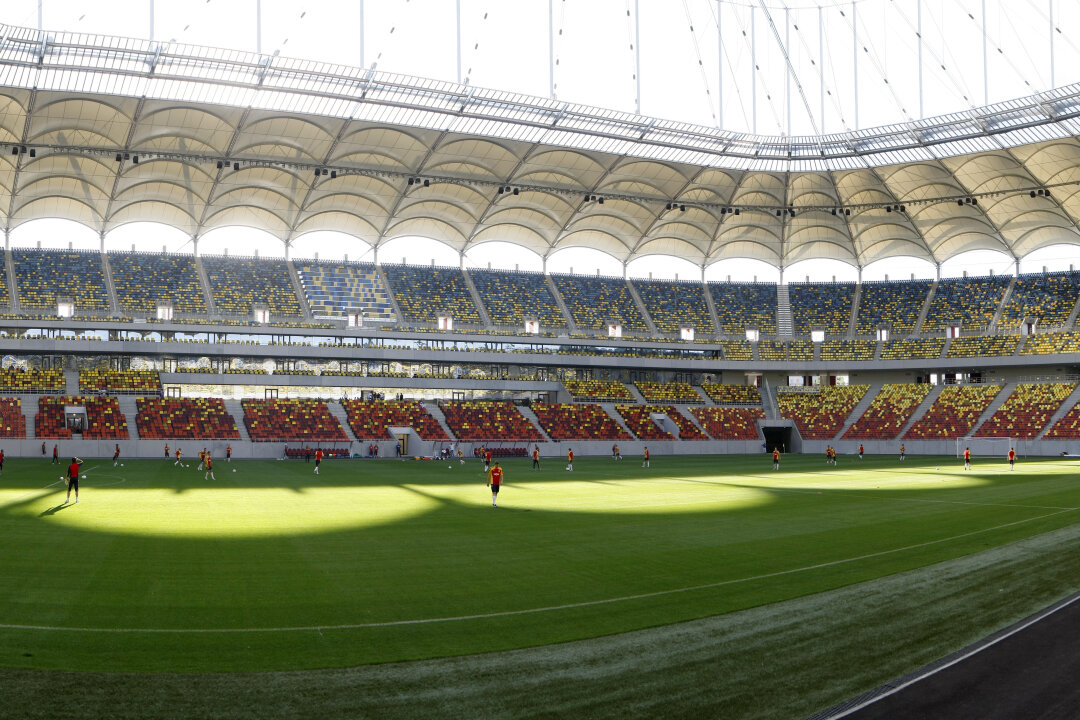 La ora 17:54, fotbaliştii au păşit în premieră pe gazon. Întîmplător sau nu, primul dintre ei a fost Ciprian Marica, unul dintre liderii echipei. El s-a închinat, spunînd la fel ca şi Ovidiu Petre şi ceilalţi colegi de echipă că speră să le poarte noroc noul stadion. Miraţi, ei au inspectat stadionul ridicîndnd privirile pînă spre acoperiş. Şi au lăsat senzaţia că sînt impresionaţi.