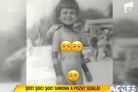 Prezentand o serie de fotografii din copilarie, in care aparea "complet goala", Simona a reusit sa starneasca zambetele audientei. "Asta a fost momentul meu de glorie. Sper ca doamna Alice Pornache, de la revista cu pricina, n-a cazut sub birouri. Si chiar daca a cazut, stiu ca n-a ajutat-o nimeni", a spus prezentatoarea Acces Direct, folosind cu maxima eficienta cea mai de temut arma - ironia.