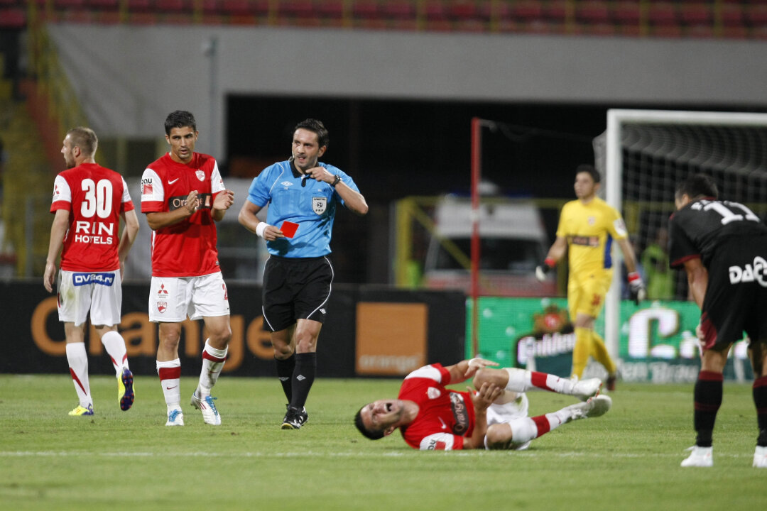 Arbitrul Sebastian Colţescu i-a arătat "roşu" direct mijlocaşului rapidist după ce acesta l-a călcat pe Dragoş Grigore. Arbitrul a apreciat ca intenţionat faultul rapidistului şi l-a trimis la vestiare. Bineînţeles, decizia centralului a atras nemulţumirea giuleştenilor, care l-au luat cu asalt pe Colţescu, astfel că Surdu şi Nicolae Grigore s-au ales şi ei cu avertisment.