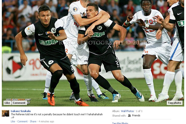 Fundaşul clujenilor, Lukasz Szukala, a postat pe contul său de Facebook o fotografie care arată clar faptul că a fost ţinut în careu de Sorin Ghionea la o fază petrecută în careul tîrgu-mureşenilor în minutul 15 al partidei. Sub imagine, polonezul (numărul 2) a scris "Arbitrul mi-a spus că nu este penalty pentru că nu m-a atins! Hahahahahah".