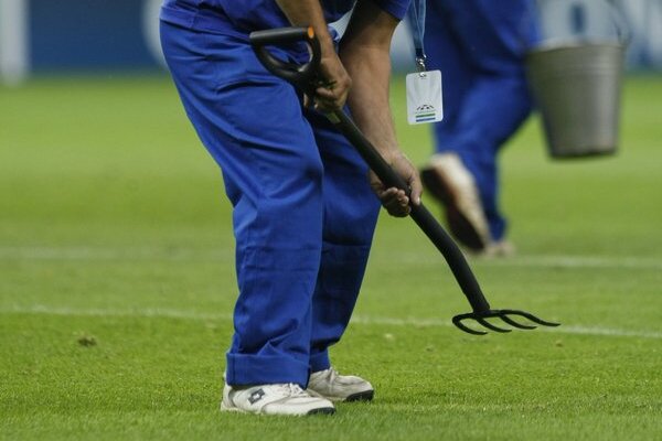 Organizatorii s-au văzut nevoiţi să intervină la pauză pentru a indrepta micile defecţiuni ale gazonului, dar au ales o soluţie inedită. Îngrijitorii s-au înarmat cu cîte o furcă şi o găletuşă şi s-au apucat să umple găurile din iarba "Naţionalului".