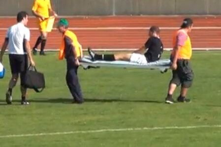 După ce s-au chinuit cîteva zeci de secunde să ridice targa cu jucătorul accidentat, aceştia l-au scos în afara terenului pe fotbalist. Dar cînd să-l pună jos, unul dintre medici a căzut peste piciorul lovit al jucătorului, provocîndu-i acestuia strigăte de durere.