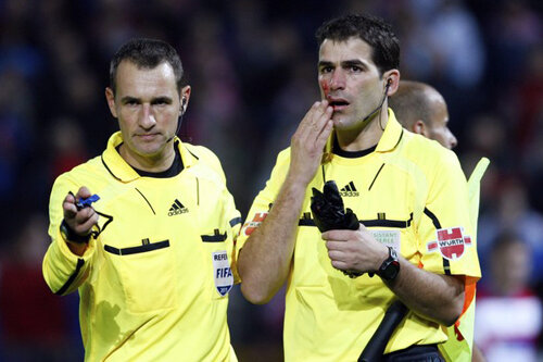 Asistentul a început să sîngereze abundent, iar centralul partidei a decis să întrerupă partida. În prima fază, jocul a fost suspendat pentru 20 de minute, însă cum arbitrul lovit tot nu şi-a revenit, meciul a fost întrerupt definitiv. Vezi mai jos VIDEO!
