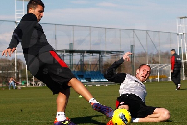 Jumătate din echipă a lucrat mai mult fizic, în timp ce restul fotbaliştilor au primit mingea. Strătilă şi Curtean par integraţi deja în grupul cîinilor roşii, fostul astral, crescut la Steaua, primind chiar aplauze la una dintre reuşite. Cosmin Matei este la fel de dezinvolt ca şi la Steaua, pune osul la bătaie şi pare decis să şteargă din impresia proastă lăsată în ultima perioadă.
