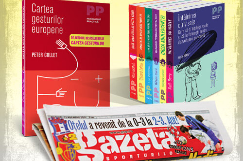 Gazeta Sporturilor continuă seria de cărţi de psihologie practică, pe care le publică în parteneriat cu Editura Trei. Astăzi, la toate chioşcurile de ziare puteţi găsi "Cartea gesturilor europene", scrisă de Peter Collett, autorul bestsellerului "Cartea gesturilor".