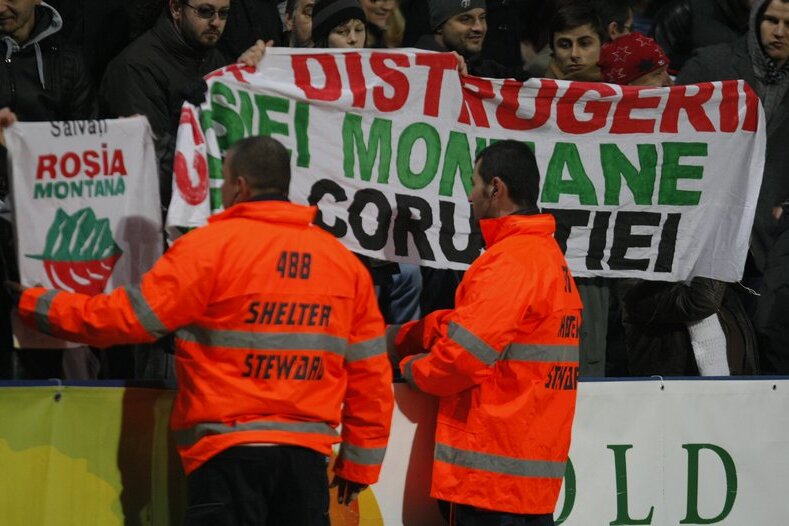 Cîţiva spectatori au afişat la un moment dat un mesaj pe care se putea citi "Stop distrugerii Roşiei Montane, stop corupţiei", moment în care stewarzii au intervenit şi le-au cerut să ascundă banner-ul (foto). Suporterii au refuzat în primă fază, dar s-au conformat apoi după ce la faţa locului şi-au făcut apariţia jandarmii, incidentul încheindu-se paşnic.