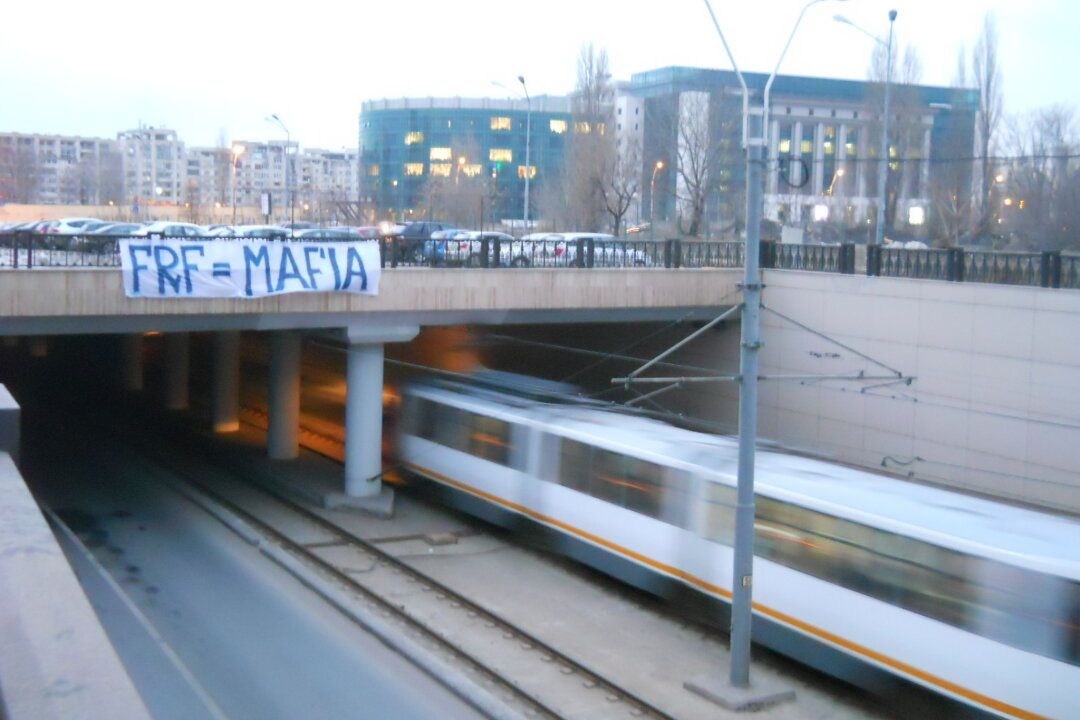Suporterii români continuă protestele împotriva şefilor fotbalului românesc! Indiferenţi la conferinţa de presă pe care Mircea Sandu a susţinut-o în compania vechilor lideri ai suporterilor, cei de la Asociaţia Suporterilor Români şi-au sesizat nemulţumirea prin bannere împrăştiate prin punctele cele mai circulate din Capitală. "FRF=MAFIA" s-a putut citi în Piaţa Victoriei, în Piaţa Unirii şi pe Bulevardul Kogălniceanu (vezi galeria foto).