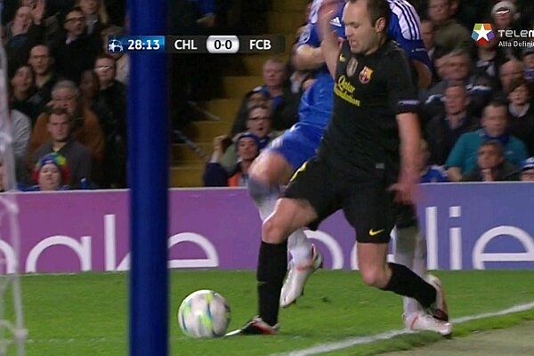 Într-o acţiune lateral stînga, Andres Iniesta l-a driblat pe Gary Cahill şi a pornit spre poarta gazdelor. Exact la intrarea în careu, fundaşul londonezilor a revenit şi l-a împins evident pe spaniol, dezechilibrîndu-l. Brych nu a văzut nimic neregulamentar.