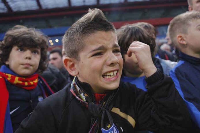 Puştiul al cărui banner a fost confiscat de stewarzi a fost eroul unui material apărut acum cîteva zile în Gazetă. Atunci, el a fost unul dintre copiii care s-au fotografiat cu Cupa UEFA alături de un puşti rapidist şi de Dani Coman şi Sorin Paraschiv, eroi ai "sfertului" UEFA din 2006. Pe copil îl cheamă Marius, are 9 ani, e junior la una dintre grupele trupei din Ghencea şi e nelipsit la meciurile echipei sale. Cînd a ajuns aseară acasă a postat un mesaj pe facebook: "Am stat toată ziua să lucrez la acest banner. Am murdărit şi gresia şi m-a certat mami, dar oamenii de ordine l-au luat. De ce? Cu ce am greşit?"