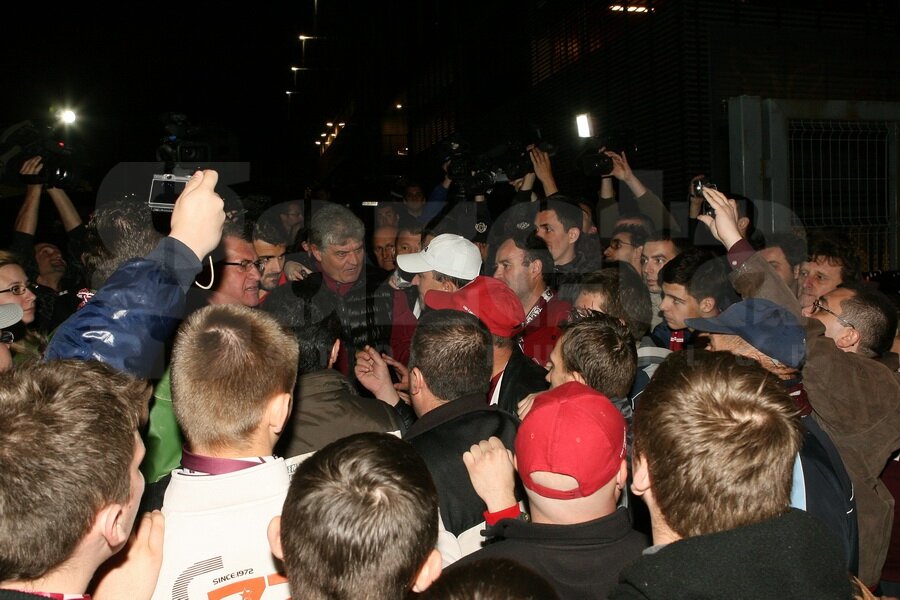 Antrenorul, însoţit de preşedintele Iuliu Mureşan, dar şi de căpitanul Cadu au ieşit de la vestiare să discute cu suporterii nervoşi. CFR Cluj poate fi detronată de Dinamo, dacă roş-albii înving pe Ceahlăul.