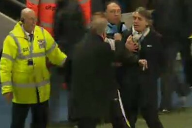 În repriza secundă a derby-ului City - United 1-0, nervii au cedat pe cele două bănci de rezerve după ce De Jong l-a faultat pe Welbeck. Ferguson şi Mancini au sărit ca arşi şi s-au îndreptat ameninţător unul spre celălalt. Arbitrul de rezervă a intervenit între cei doi şi cearta s-a consumat la nivel verbal, cei doi antrenori avînd un schimb de replici dure. Click aici pentru imagini video cu disputa dintre Ferguson şi Mancini