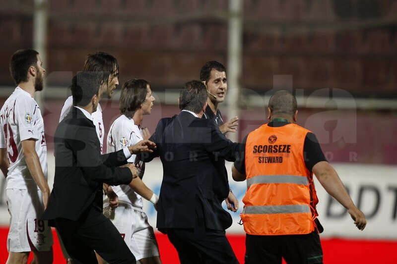 Imediat după fluierul de final al primei reprize din partida cu FCM Tg. Mureş, rapidiştii s-au dus să-l certe pe arbitrul Robert Dumitru.