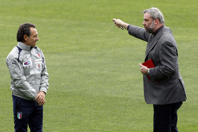 Luni, părintele Massimiliano Gabbricci a fost la Coverciano. S-a rugat pentru succesul peninsularilor, a sfinţit terenul de antrenament sub privirea concentrată a lui Prandelli şi i-a binecuvîntat pe jucători.