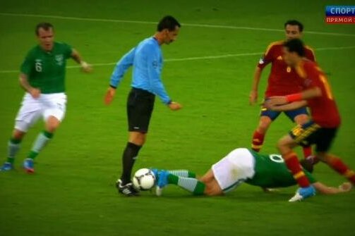 Spania a învins Irlanda cu 4-0, dar a primit şi ajutor din parte arbitrului. În minutul 35 al partidei, centralul Pedro Proenca l-a împiedicat brutal pe irlandezul Keith Andrews :)