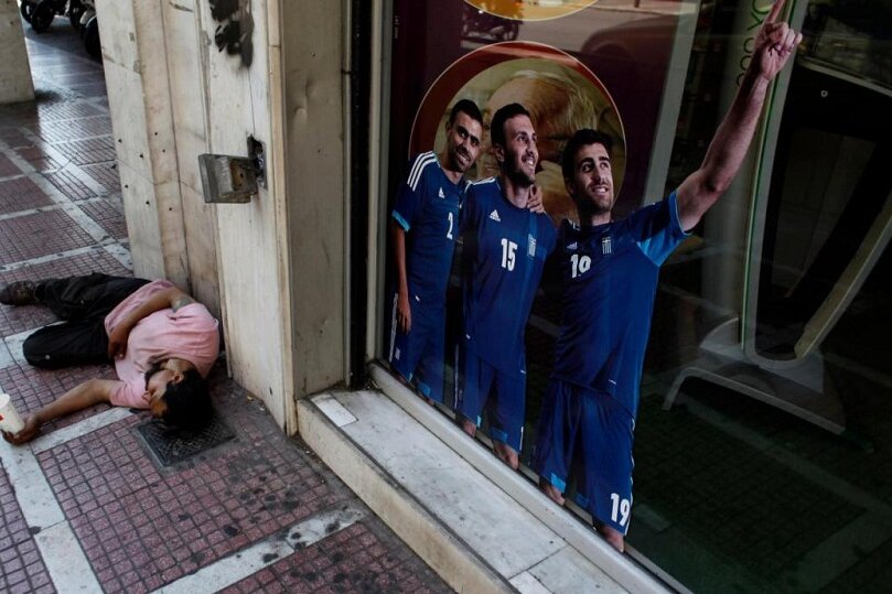 Grecia votează astăzi pentru a doua oară în ultimele şase săptămîni, în speranţa că ţara va reuşi să fie condusă de o majoritate parlamentară stabilă. Un om cerşeşte în Atena la picioarele unei naţionale care încearcă să aducă un zîmbet prin calificarea în sferturile de finală de la Euro. Acolo, într-un fel de ironie a sportului, Grecia poate întîlni Germania.