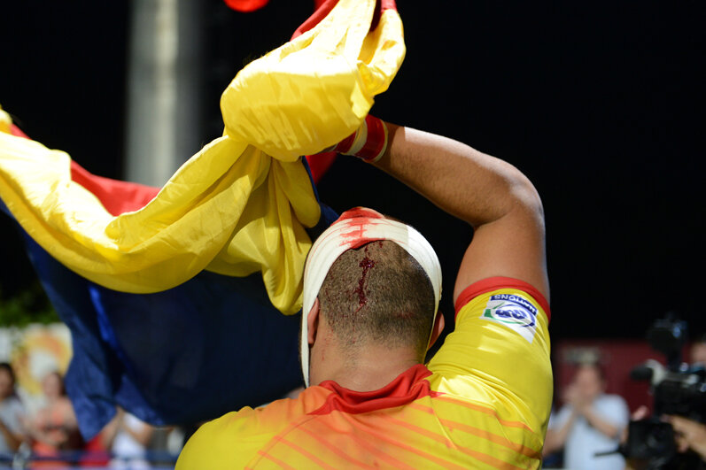 Ultima fază a finalei IRB Nations Cup dintre România şi Italia A. 17-13 pentru "stejari", dar italienii atacă în valuri. Românii se apără cu dinţii la zece metri de buturi. Viorel Lucaci, linia a treia din echipa "tricoloră" rămîne întins pe gazon. Meciul se termină, românii încing hora bucuriei. Au cîştigat, în sfîrşit, trofeul. Lucaci vine şi el, vrea să fie şi el părtaş la triumf. Are faţa plină de sînge.