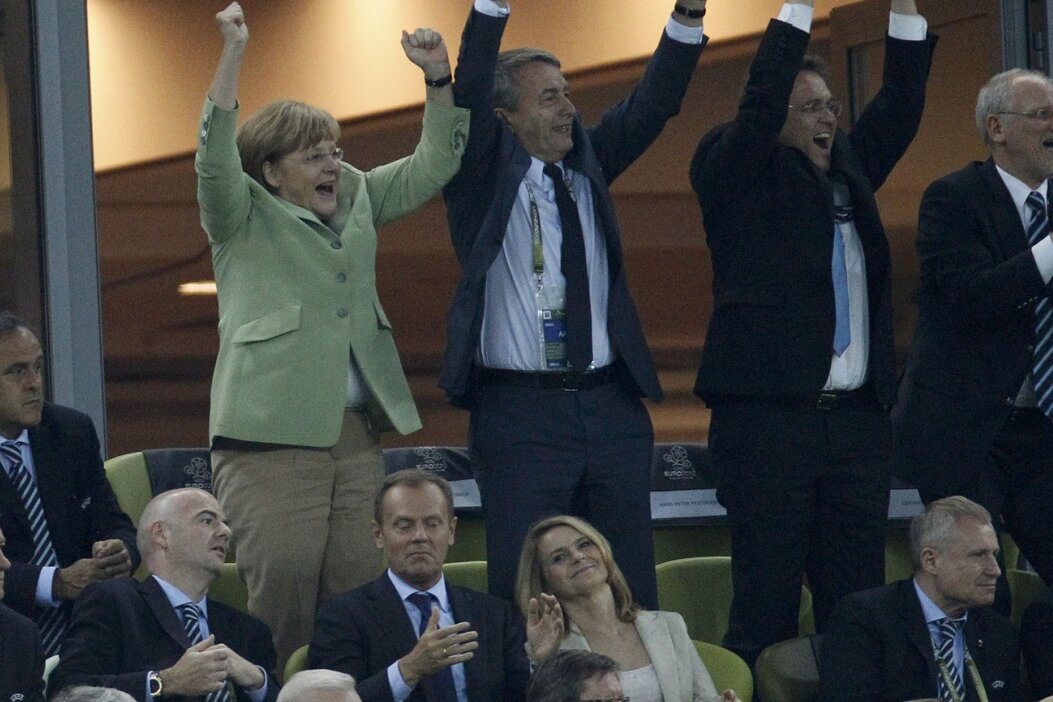 Suporteră pătimaşă a reprezentativei conduse de Joachim Low, cancelarul german Angela Merkel nu a ratat partida nemţilor cu Grecia, 4-2 în ”sferturile” CE 2012. Şi chiar s-a comportat ca un suporter. Ea a celebrat fericită ca un copil la fiecare gol, ba s-a şi ridicat în picioare cu mîinile ridicate triumfător.