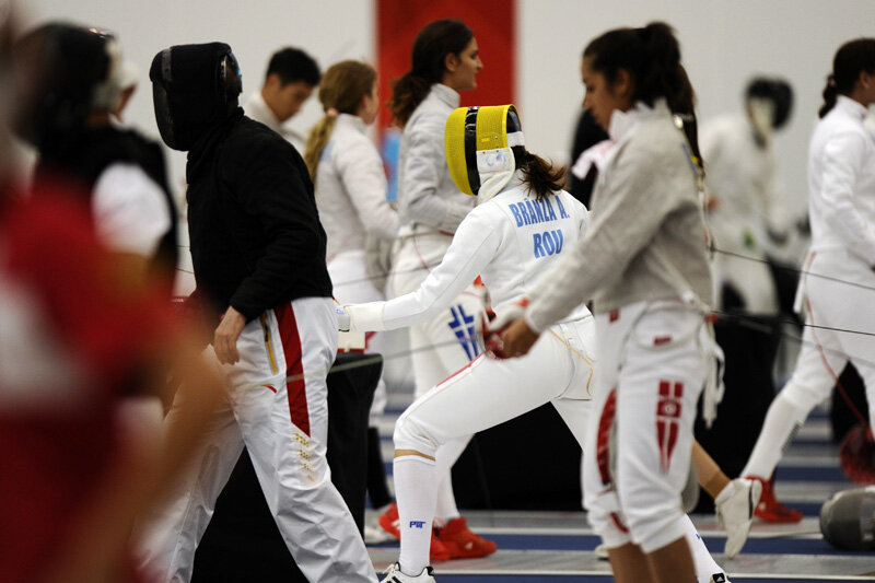 Printre picioare care trepidează, braţe înarmate care se avîntă cu spor înainte şi corpuri care dansează parcă se zăresc un pic şi românii. Rareş şi-a păstrat tricoul roşu şi şortul albastru în timp ce trage cu Mihai Covaliu, care şi-a pus un echipament de antrenor, complet bleumarin. Spre final, îmbracă şi Dumitrescu ţinuta albă. Măştile colorate, roşu, galben şi albastru, ale spadasinelor apar ca nişte flash-uri în mulţimea aflată în permanentă mişcare.