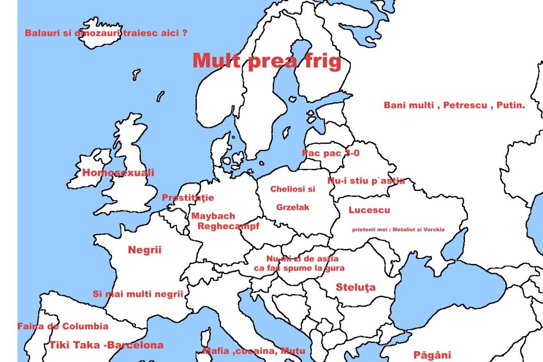 Fotografia trimisă de AndreiXP pe pagina Gazetei de Facebook este foarte expresivă. Ca de exemplu, finanţatorul echipei din Ghencea vede în Spania doar "Tiki Taka Barcelona", în timp ce în Franţa nu observă decît "negrii". Olanda o vede ca pe o ţară a prostituatelor, iar în Polonia, ţara din care este fostul jucător al Stelei, Grzelak, o consideră plină de chelioşi.