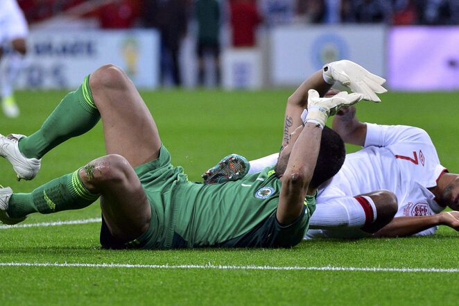 Şoc pe Wembley, la puţine minute de la startul meciului Angliei cu San Marino! La o fază în careul oaspeţilor, portarul Simoncini a ieşit să prindă un balon, dar l-a lovit violent pe Theo Walcott. Atacantul Arsenalului a căzut ca fulgerat la pămînt şi n-a mai mişcat.