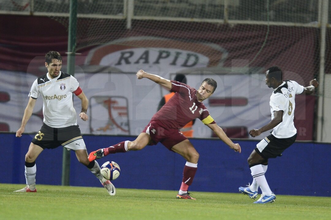 min. 31. Albuţ este busculat de Budescu, Haţegan acordă fault pentru Rapid.