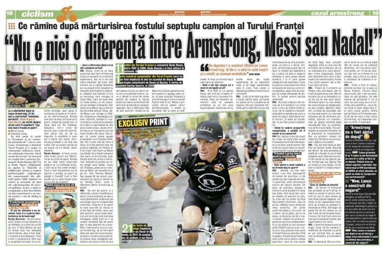 Un interviu amplu, pe două pagini, despre colecţionarul de tricouri galbene cu doi comentatori care au urmărit perioada de 7 ani în care Armstrong a dominat Turul Franţei şi a negat vehement că ar fi utilizat substanţe interzise. O discuţie deschisă despre dopaj în sport, cum a pus Armstrong la punct un mecanism care a păcălit pe toată lumea şi cum cred cei doi intervievaţi că poate fi oprită o nouă replică a lui Lance în sport numai în ediţia tipărită a Gazetei Sporturilor, nu şi pe site.