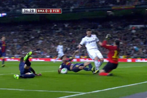 Cele mai controversate faze din partida tur dintre Real Madrid şi Barcelona, scor 1-1, s-au petrecut în minutele 37 şi 82.