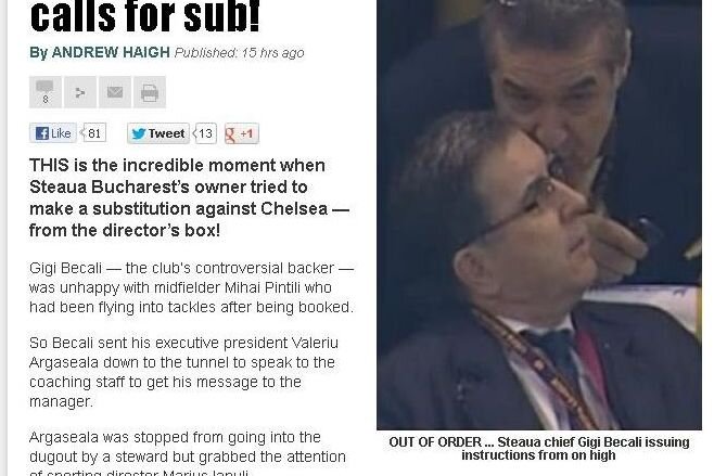 Jurnaliştii britanici povestesc evenimentul: "Gigi Becali, controversatul patron al Steleu, a fost nemulţumit că Pintilii juca agresiv chiar şi după ce a primit un galben. Aşa că Becali l-a trimis pe preşedintele executiv Valeriu Argăseală să comunice staff-ului tehnic să-l scoate pe mijlocaş. Argăseală a coborît prin tunel la nivelul gazonului şi i-a transmis mesajul directorului sportiv Marius Ianuli. De la acesta a ajuns la Mihai Stoica, managerul echipei, cel care i-a comunicat apoi schimbarea antrenorului Laurenţiu Reghecampf. Dar chiar cu puţine clipe înainte, Reghecampf făcuse deja această schimbare.