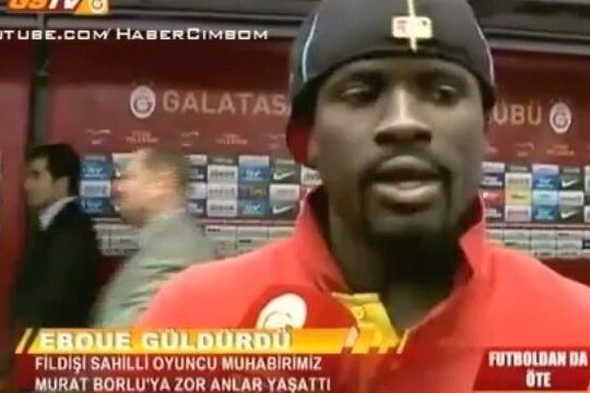 Emmanuel Eboue este relaxat înaintea confruntării cu Real Madrid din sferturile Ligii Campionilor şi l-a ironizat pe un reporter de la Galatasaray TV.