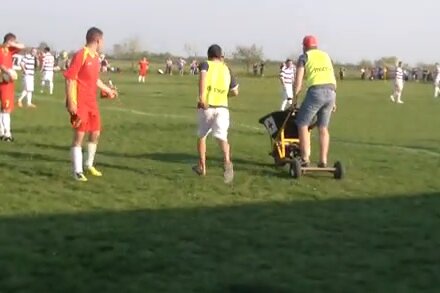 Într-un meci disputat în Liga a V-a, Timişul Urseni-Poli Timişoara 0-9, un jucător accidentat a fost preluat cu o "maşinărie" nonconformistă şi dus la marginea terenului.