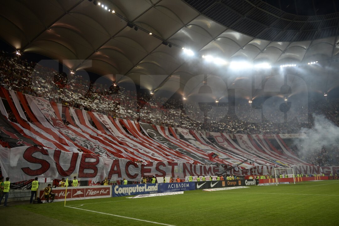 Pe lîngă coregrafia de la începutul partidei, suporterii roş-albilor au avut şi un banner ironic la adresa rivalilor. Aceştia au ironizat două dintre cîntecele galeriei Stelei din ultimii ani şi s-au întrebat ce urmează: "După Scooter Maria şi Ţapinarii urmează Fuego sau Clejanii?", s-a văzut pe un banner al galeriei "cîinilor".