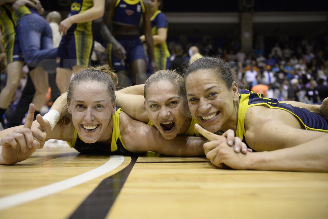 Arădencele abia şi-au început însă fiesta. A curs şampania, s-a cîntat de bucurie, s-au făcut poze. Chrissy Givens şi Monica Brosovszky Boriga au luat toba galeriei şi toată echipa a făcut trenuleţul fericirii, în ritmul dictat de coechipierele lor.