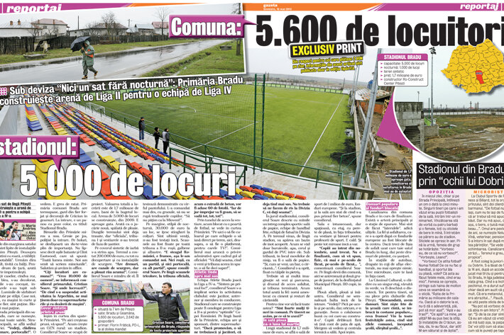 Despre stadionul din Bradu, un stadion prea mare pentru o comună atît de slab populată, cu o echipă de Liga a IV-a, aţi putut citi în ediţia tipărită a "Gazetei" de sîmbătă, 18 mai. Investiţia se ridică la aproximativ 1,7 milioane de euro. Finanţată din bugetul local, arena din comuna argeşeană are nocturnă, gazon sintetic şi o capacitate de 5.000 de locuri. Comuna are 5.600 de locuitori.