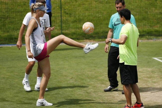 Eliminată surprinzător în turul doi la Wimbledon, Maria Şarapova şi-a îndreptat atenţia spre a-şi îmbunătăţi calităţile fotbalistice.