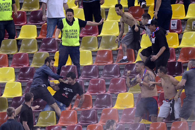 Sute de scaune din sectorul rezervat steliştilor zburau între ultraşii dinamovişti şi stelişti, multe dintre ele ajungînd chiar şi pe gazon, la doar cîţiva metri de poarta în care Ciprian Tătăruşanu se încălzea.