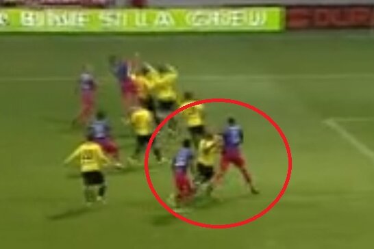 "Gardoş îl trînteşte la pămînt pe jucătorul Braşovului. Ce e mai grav este că asistentul nu i-a văzut, deşi îi are în prim-plan.