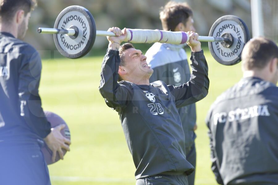 Preparatorul german al Stelei a programat cîteva exerciţii foarte dificile pentru jucători, ridicări cu haltere şi gantere, dar şi cu mingi de 5 kilograme.