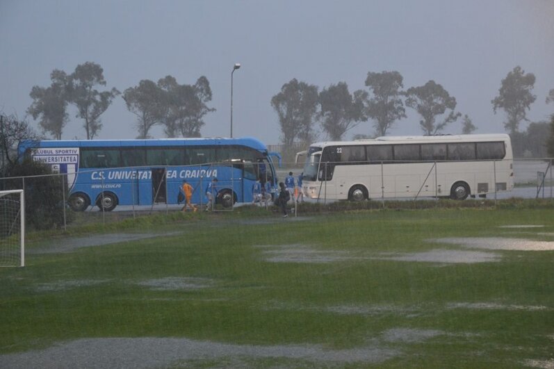 Victimă a ploilor din Turcia a fost şi CSU Craiova. Formaţia antrenată de Ovidiu Stîngă s-a retras la cabine în minutul 30 al unui meci de pregătire cu Yonsei, pentru că terenul devenise impracticabil (foto sus).