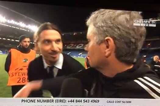 În timp ce The Special One explica televiziunii britanice cum a reuşit a 8-a sa calificare în semifinalele Ligii Campionilor, Zlatan s-a furişat pe la spatele portughezului şi l-a surprins cînd i-a urat "Mult noroc!". Mourinho s-a întors şi i-a dat o îmbrăţişare suedezului, după care i-a urat toate bune pentru familie.
