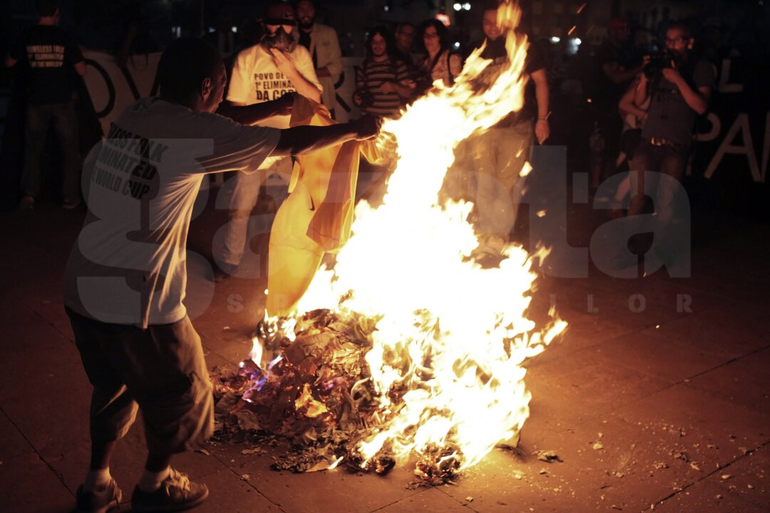 Sindicaliştii au ieşit ieri în stradă, au dat foc mai multor tricouri ale naţionalei lor şi au afişat bannere în care le reproşează acestora faptul că nu sînt bani investiţi pentru spitale sau învăţămînt, dar s-au găsit atîtea resurse pentru ca acest Campionat Mondial să se desfăşoare.