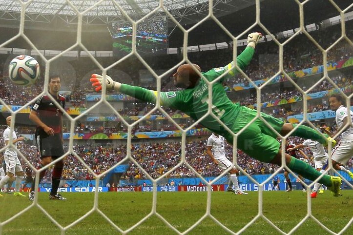 Şi a început meciul. Cu "autobuzul" american parcat în faţa porţii şi-o dominare copleşitoare a nemţilor: 88 la sută posesie după primul sfert de oră. Însă finalizarea a lăsat de dorit. Muller a ratat o foarfecă, Podolski reluarea. Iar puţin mai tîrziu, Howedes şi Mertesacker s-au încurcat reciproc. Şi cam atît. Senzaţională, în schimb, reacţia tribunei. La prima tentativă a jucătorilor de a o lăsa mai moale, spectatorii au început să fluiere copios, obligîndu-i să mărească din nou ritmul. Totuşi, golul n-a venit: 0-0 la pauză.