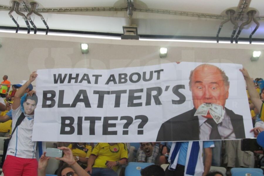 Aproape de masa presei, în sectorul în care s-a aflat cea mai mare parte a galeriei uruguayene, doi suporteri purtînd masca lui Suarez ţineau un banner uriaş. Era un mesaj în engleză: "What about Blatter's bite?". Ce spuneţi de muşcătura lui Blatter? Un fotomontaj în care şeful forului de la Zurich face ochii mari cînd mănîncă un pumn de dolari.