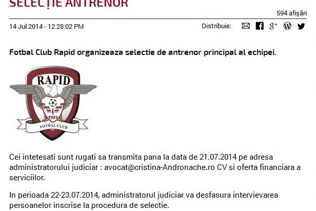 Rămasă fără antrenor după plecarea lui Viorel Moldovan la naţionala de tineret, Rapid organizează concurs pentru a găsi un nou tehnician. Giuleştenii au postat un anunţ pe site-ul oficial.