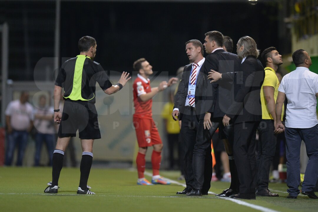 Antrenorul dinamovist Flavius Stoican a protestat de pe margine la adresa întreruperii meciului şi a fost eliminat de central.