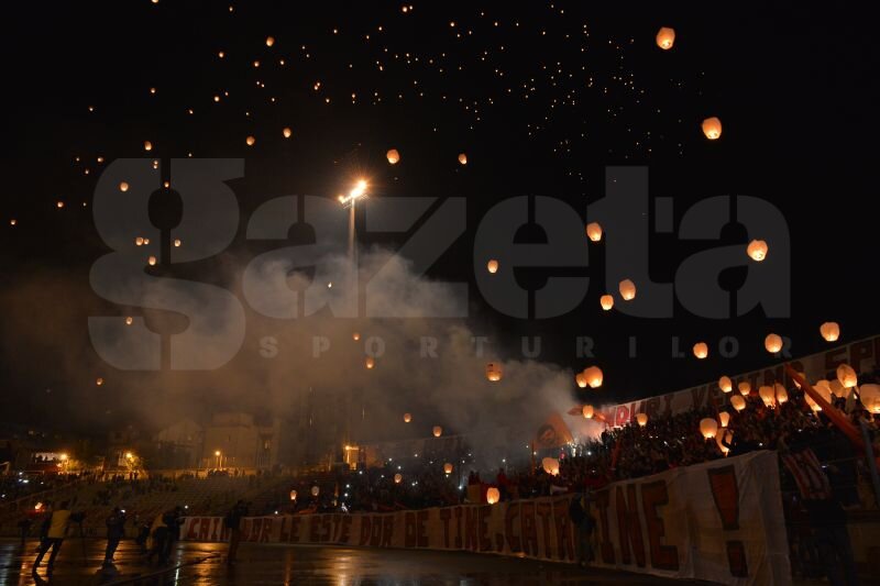 Dinamoviştii comemorează astăzi 14 ani de la moartea ”Unicului Căpitan” şi au oferit un moment emoţionant înaintea începerii partidei. Aceştia au înălaţat sute de lampioane spre cer, inscripţionate cu chipul lui Cătălin Hîldan.